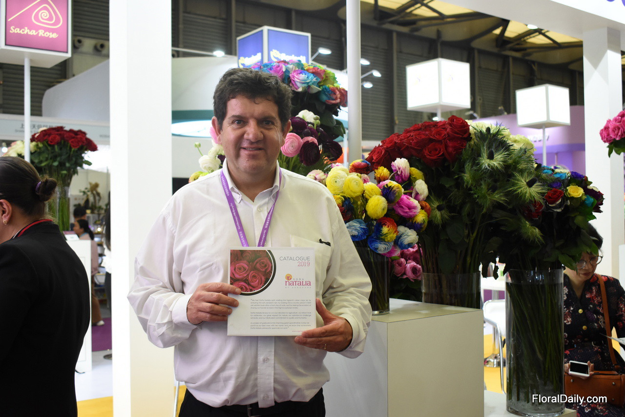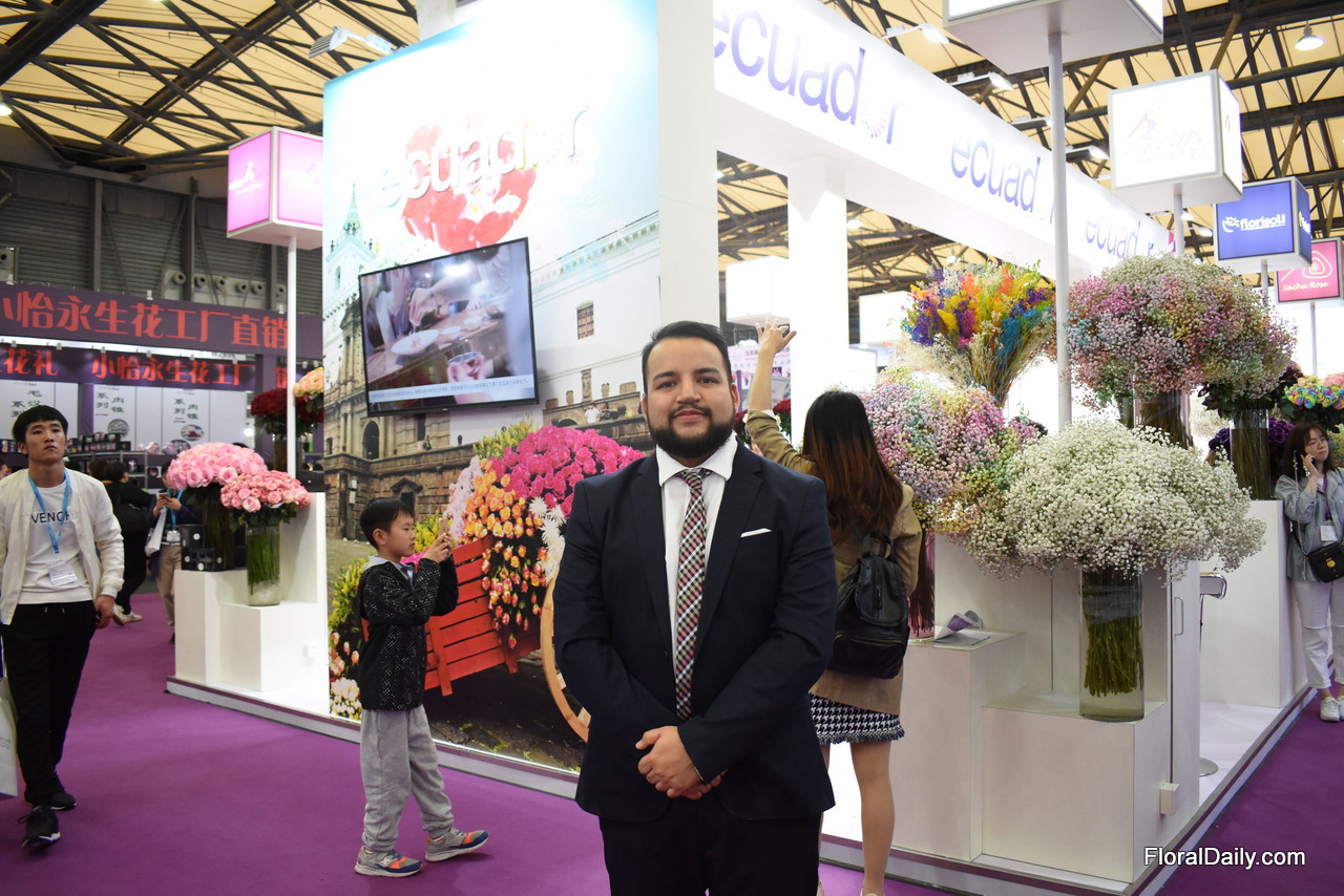 Alvaro Espinosa of Dona Natalia presenting his flowers at the Pro Ecuador pavilion. They are supplying the Chinese market for 2 years now and they are eager to increase their volumes to this country.
