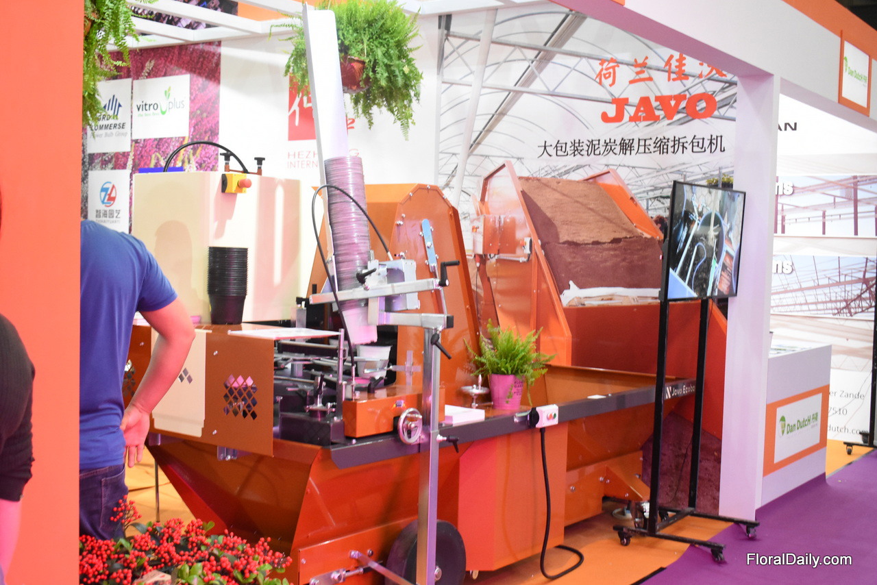 Manuel Linke and Lun Li presenting the potfiller TM 1010F, one of the three machines they are presenting at the exhibition. Last year, they opened their own sales office with technical support in Nanjing . According to Manuel, for the Chinese growers, it is now time to think about automatic solutions. "In several areas of the country, lobar costs are rising, so automatic processes becomes more interesting. The TM 1010F is interesting for the Chinese grower as many parts that are now being done manually are automated. It prepares the pots so that the young plants can be put in manually. The only manual labor is putting in the young plants. It can processes 4,000 pots per hour."