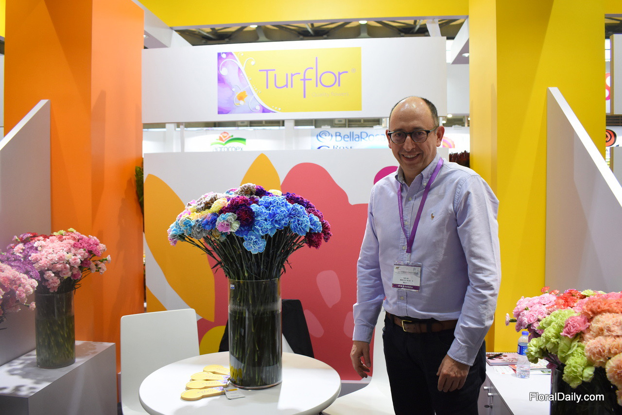 Mauricio Briceño of Turflor supplies around 1-2 percent of their carnation production to China. He feels there is room for good quality flowers on the market and in terms of infrastructure, he see that the Chinese importer is willing to learn how to deal with flowers. Over the last years, they Turflor has been investing in the process of tinting flowers and they are pleased that they can now put a product on the market with more or less a similar shelf life as that of their natural flowers. At the show, it attracted the attention of the Chinese buyers. More on this later in FloralDaily.