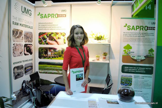 Maria Obukhova, United Minerals Group, tells about the SaproGrow. The product comes from the bottom of a lake and betters the quality of plants when mixed with soil.