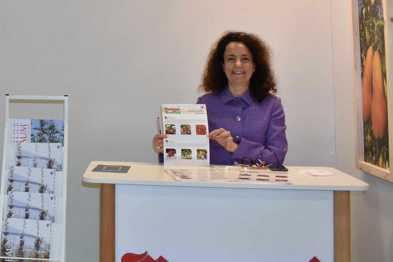 Vivai Mazzoni's stand with Antonella Colacrai who came to present three new varieties of strawberry: Edwina, Klodia and Giusy.